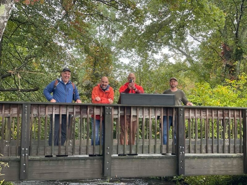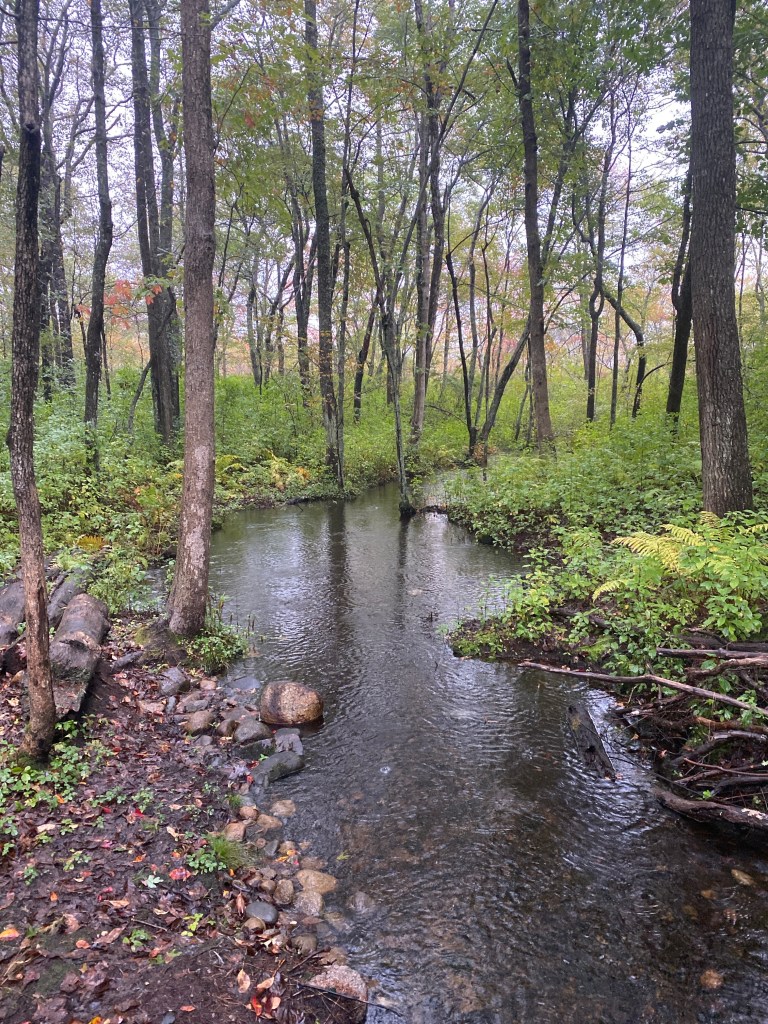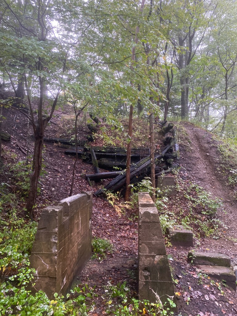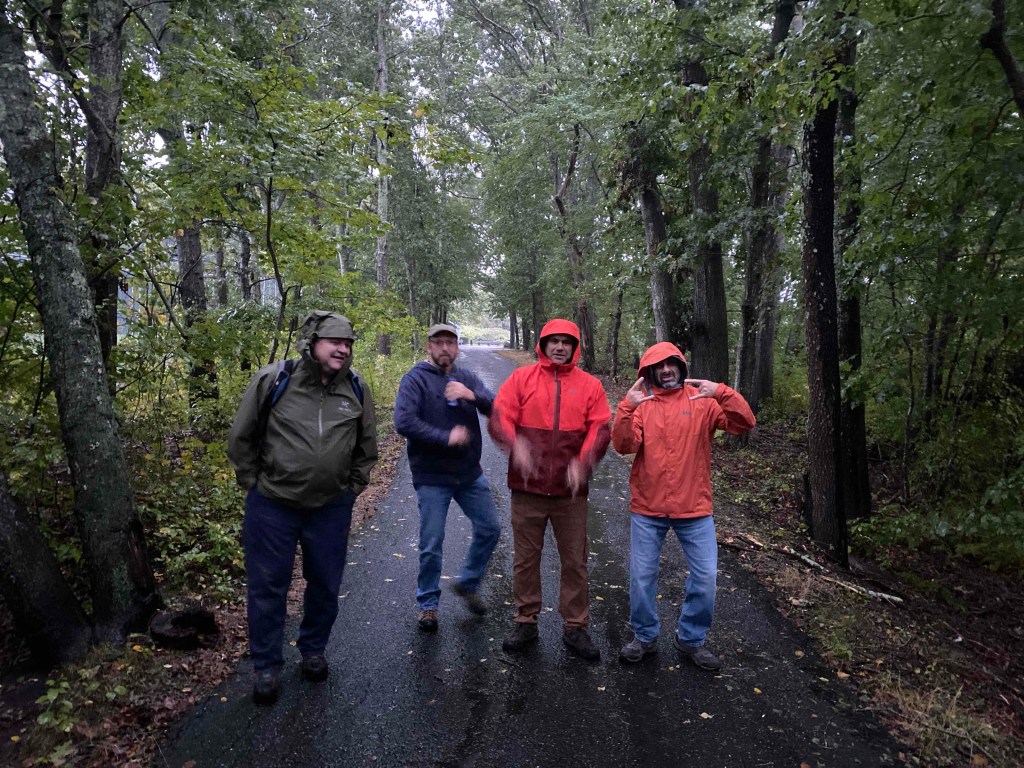 A group of adventurous hikers met at Ryan Park at 7:00a in the rain to complete a planned 5 mile hike. After two days of a rain and summer made up of just as many rainy days as non-rainy days, the group knew they would be in for a wet hike with wet brush and flooded trails. Upon arrival, the troop parked at one of the baseball fields and walked about 500 feet to pick up the trail on the south side of the Belleville Pond. Although this was the second time the group has hiked the trails in Ryan park, hiking the same trail more than once always gives you a different experience. You may hear things you haven’t heard before or see things that you missed the previous times walking the trails. Even the smells can be different based if you are hiking a trail in the winter versus in the spring. As we hiked past a cemetery and later passed a structure made from railroad ties and cement, we wondered what the area was like hundreds of years ago.