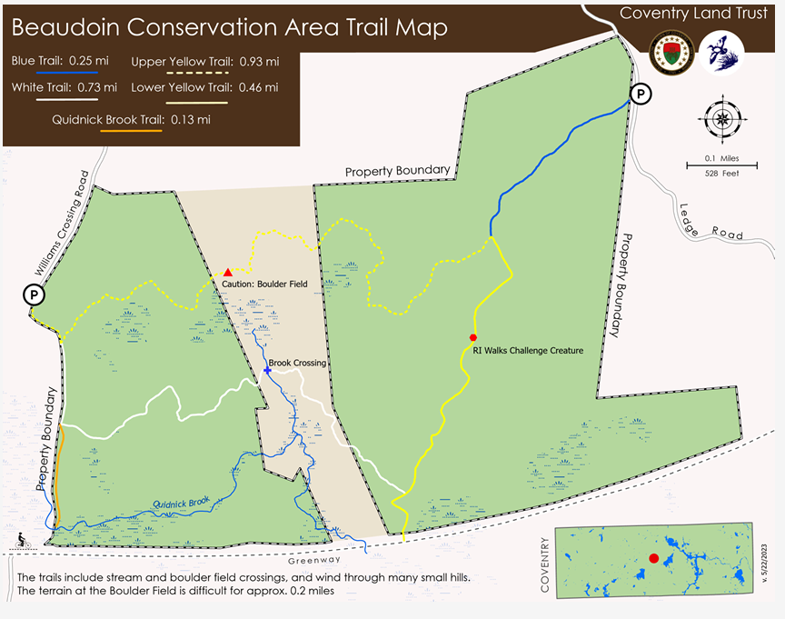 RI Walks has placed 34 “creatures” across various trails that are protected by different land trusts. As you hike the trails and come across a creature, there is a QR code to scan and register your find. These creatures can be hard to find because they can easily blend in with the landscape. However, looking for these creatures is a great way to slow us down and take a look around observing nature. There’s a lot more than trees, rocks, and streams to see when out on a hike. Be sure to take your time and look around. You might just come across a creature. Click here to learn more about the Creature Challenge.