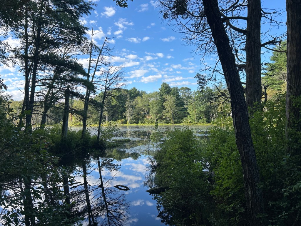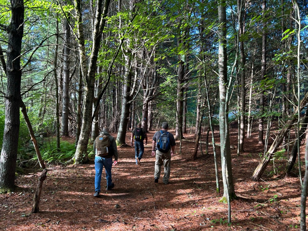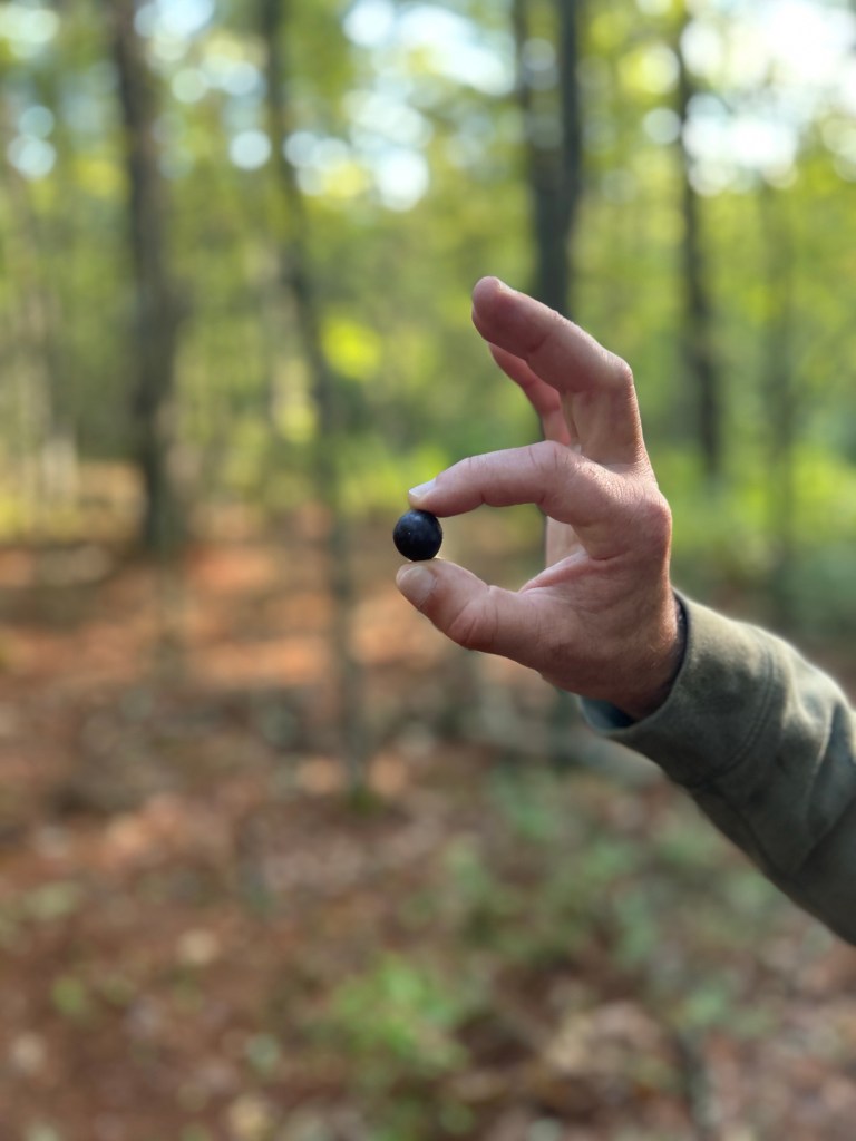 On the trail we passed a small pond and heard the soothing forest sound of what one would expect after a night of rain. With every light breeze, it sounded like we were having a light rain shower. We also came across some wild Concord grapes and took the opportunity to taste this snack nature has provided. We forgot to take a picture of the vine, so we took a picture of the last grape.