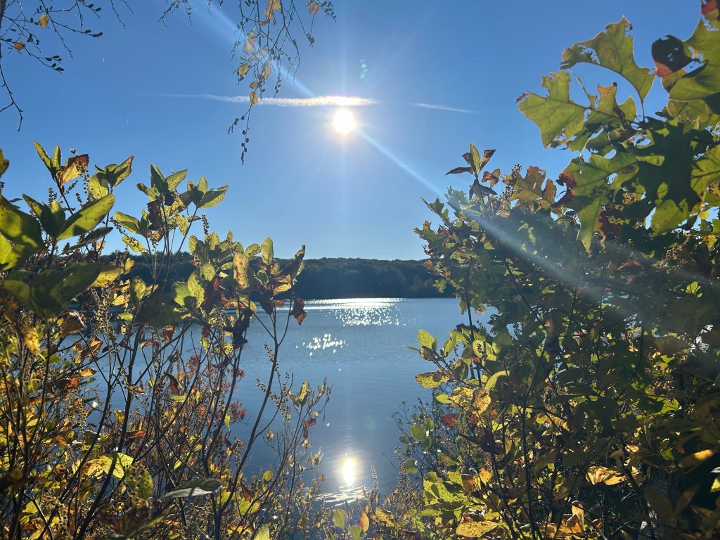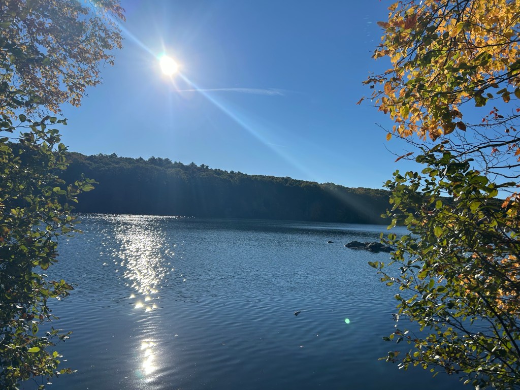 Here’s a scenic view of Olney Pond as we stepped out of the car and made our way to the trail. The sandy area is a happening place for families to come in the summer for a fresh water pond “beach” experience.