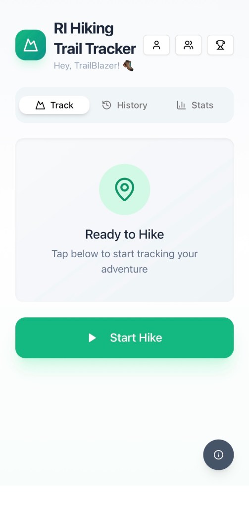 The app is currently available as a web application for quick access and easy distribution. The web application works with any browser on any device. To learn more about how to install and use the RI Hiking Trail Tracker® app, click on the App menu at the top of the RI Hiking home page. An iOS version in active development that will be available for future release on the Apple App Store