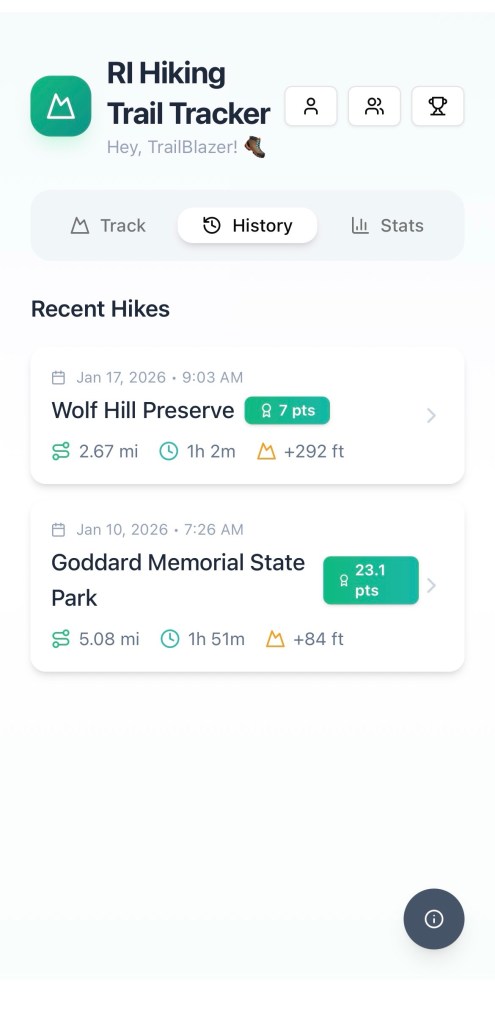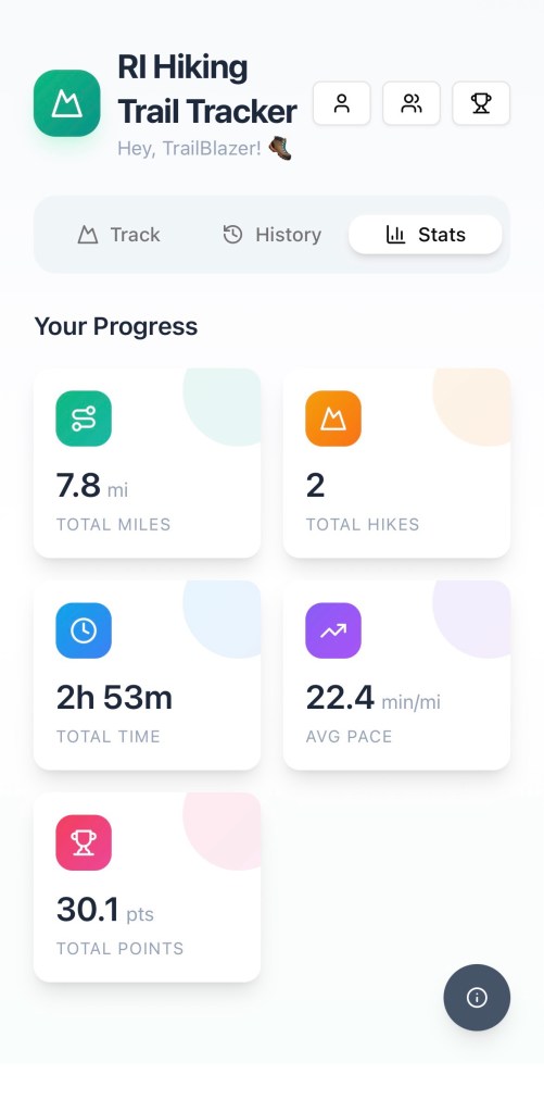The RI Hiking Trail Tracker® app lets you record your personal hikes by capturing your route, pace, elevation, and optional details like temperature and weather. These metrics are converted into a points system, designed to gamify your hikes, so that more challenging conditions earn you more points and a little extra bragging rights among friends.