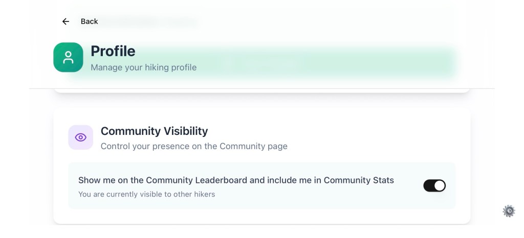 The Community page shows a roll-up of all hikers who choose to have their name visible on the leader board. There is a Community Visibility setting in the user profile page.