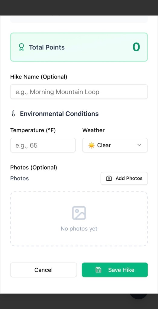 Stop the hike, by clicking the red “Stop Hike” button. The app will then prompt you to add additional information. All additional input is optional.